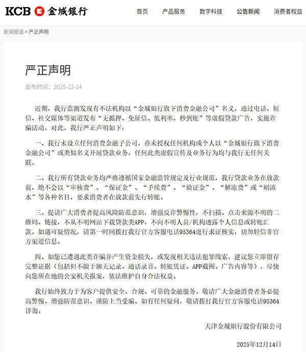 人民网天津12月15日电 (记者崔新耀)记者今天从金城银行官方网站获悉,近期,金城银行监测发现有不法机构以“金城银行旗下消费金融公司”名义,通过电话、短信、社交媒体等渠道发布“无抵押、免征信、低利率、秒到账”等虚假贷款广告,实施诈骗活动。对此,金城银行发布《严正声明》。