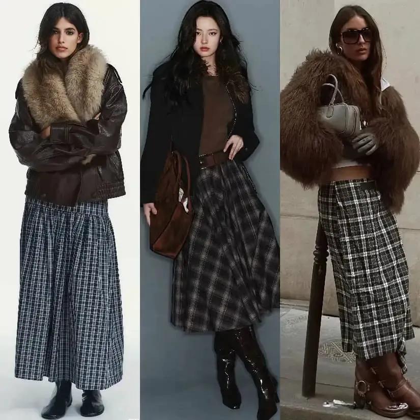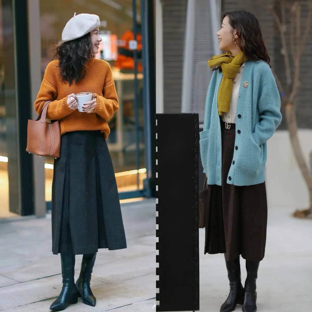 我们应该学习中间这位时尚达人,用菱格纹的 A 字半身裙搭配上棕色的毛衣和棕色的中筒靴,加上黑色外套,结合卷发造型,这样的穿搭会更有气质感。主要的是高腰小腰款的 A 字半身裙,长度盖过膝盖超过 5cm 左右,这样的裙子遮肉显瘦也不压身高。