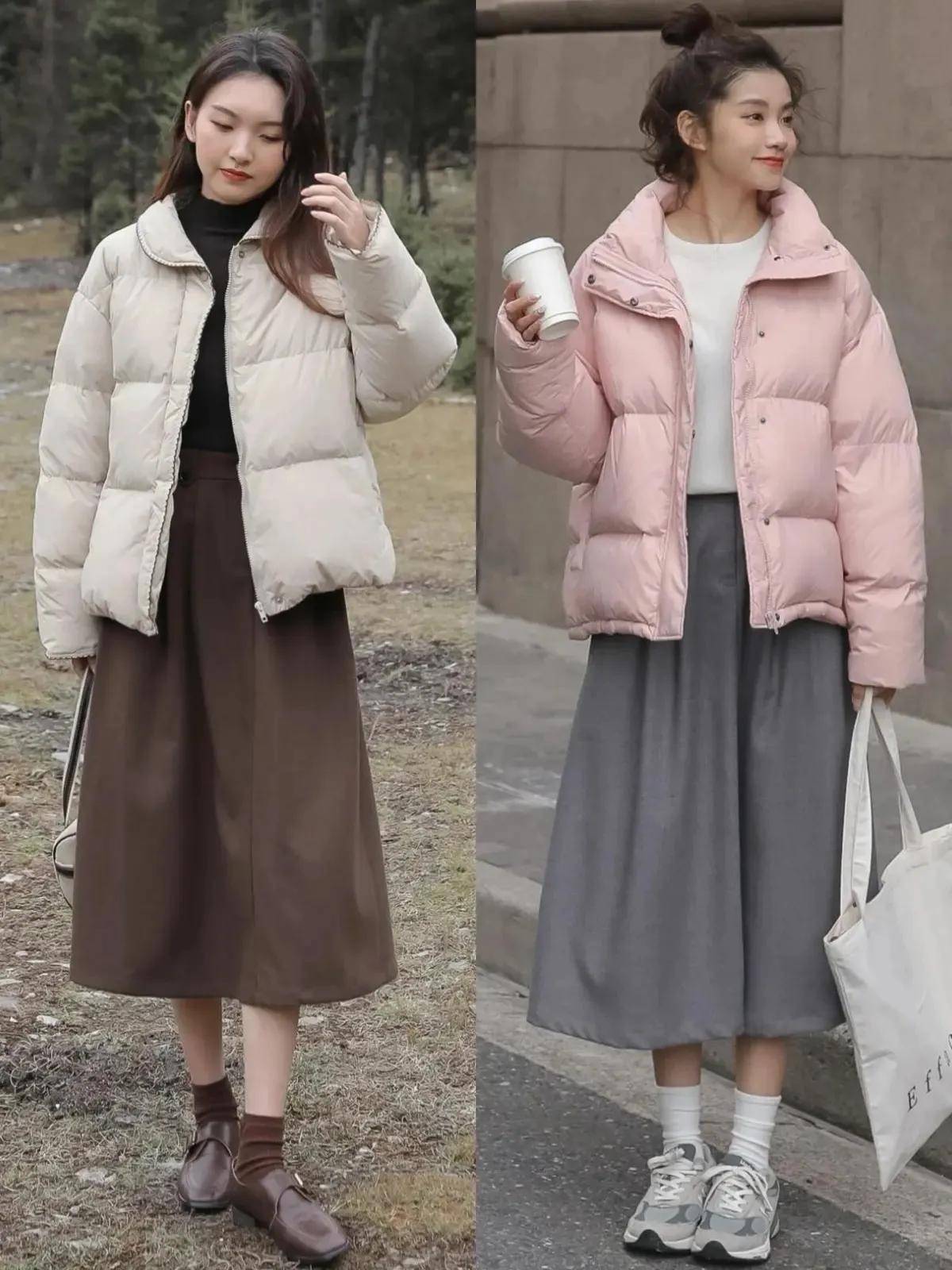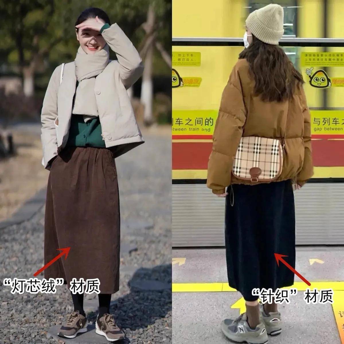 会穿搭的时尚博主已经选择了一条棕咖色的灯芯绒材质半身裙,或者是针织材质的半身裙,搭配上短羽绒服外套,脚穿老爹鞋,既保暖又时尚。咱们在寒冷的冬天完全可以借鉴以上这两套穿衣风格。