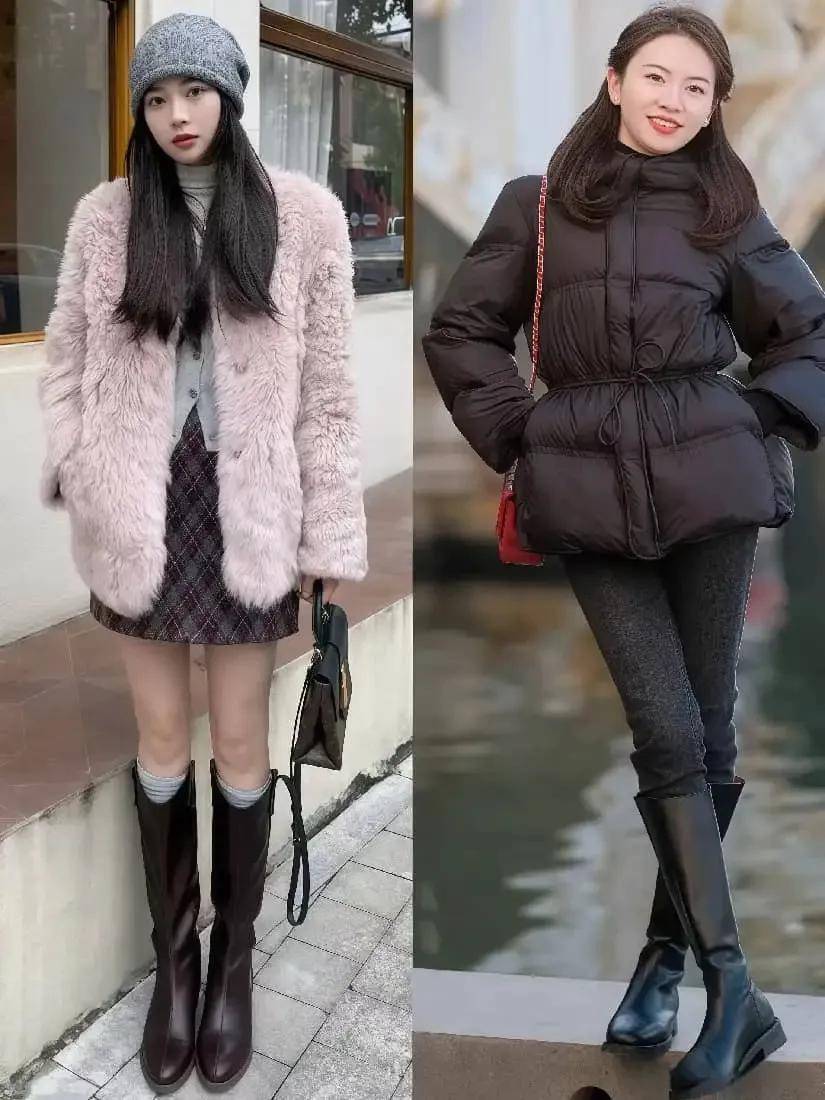 寒冷冬天,我个人还蛮推荐大家选择中筒靴的,正好裙子能把靴子盖住,冷风吹来也不怕冻着。最主要的是,只要鞋子和裙子色彩是相近色,那么就会延伸腿部线条,不会让你显矮显胖。